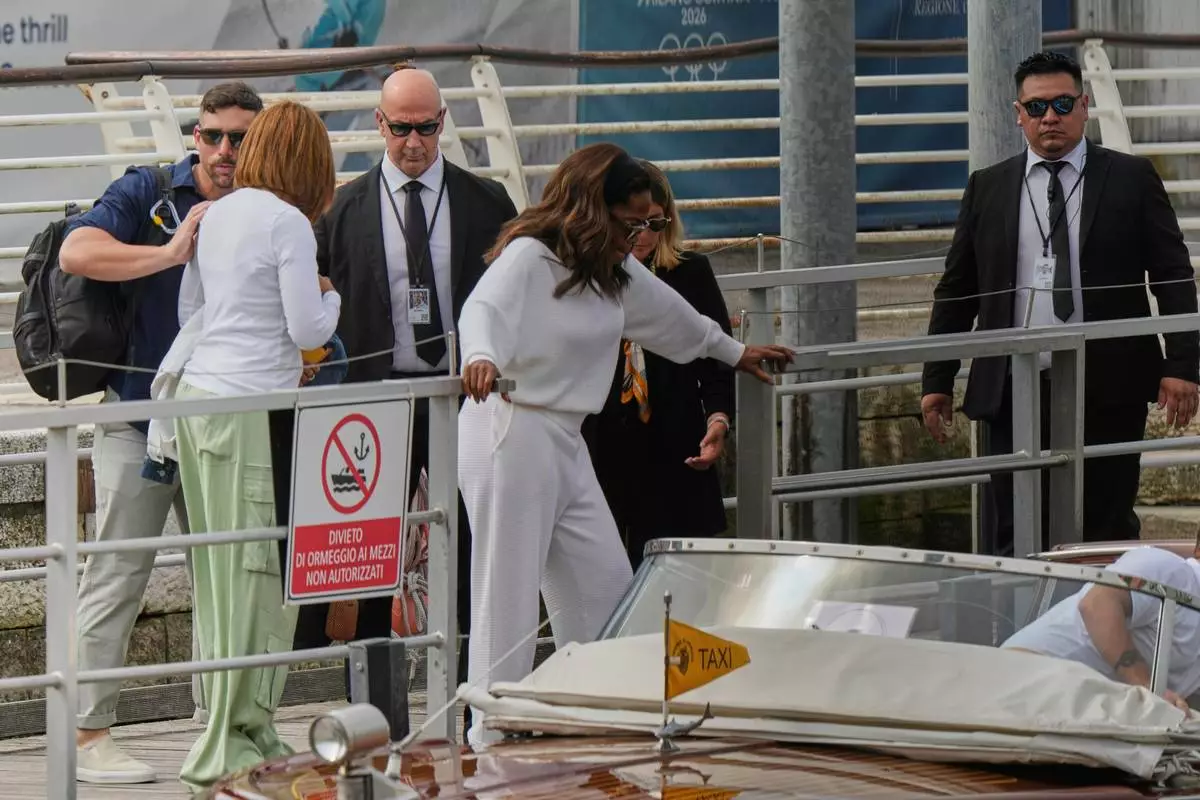Oprah Winfrey, center, arrives for the weekend wedding of Amazon founder Jeff Bezos and Lauren Sanchez, in Venice, Italy, Thursday, June 26, 2025. (AP Photo/Luca Bruno)