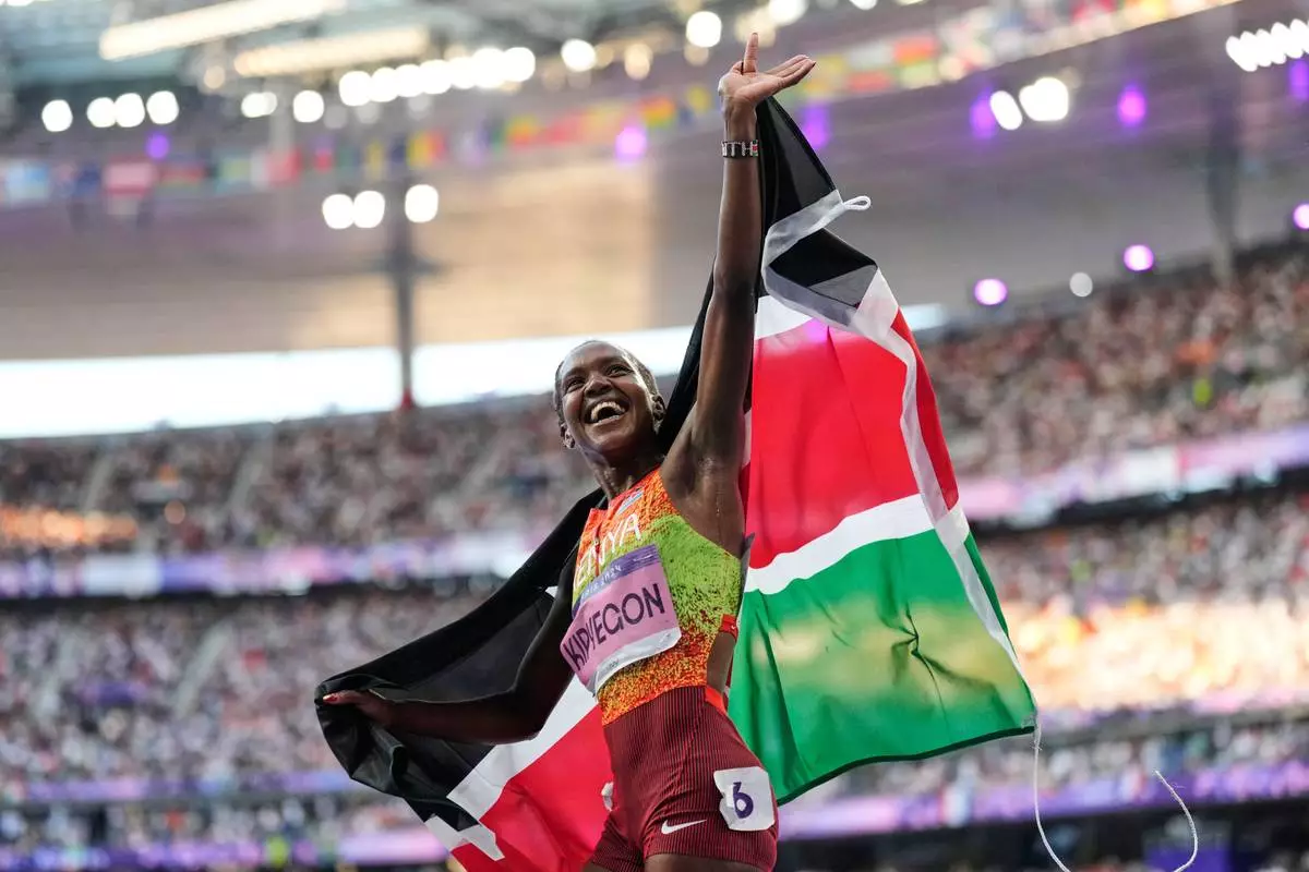 FILE - Faith Kipyegon, of Kenya, celebrates after winning the women's 1500-meter final at the 2024 Summer Olympics, Saturday, Aug. 10, 2024, in Saint-Denis, France.(AP Photo/David J. Phillip, File)