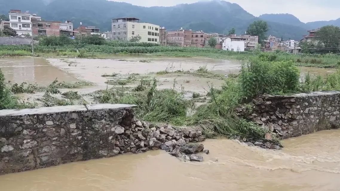 In Zhuchang Town, heavy rain caused widespread flooding of crops, with some river embankments giving way, resulting in significant damage to agricultural production.