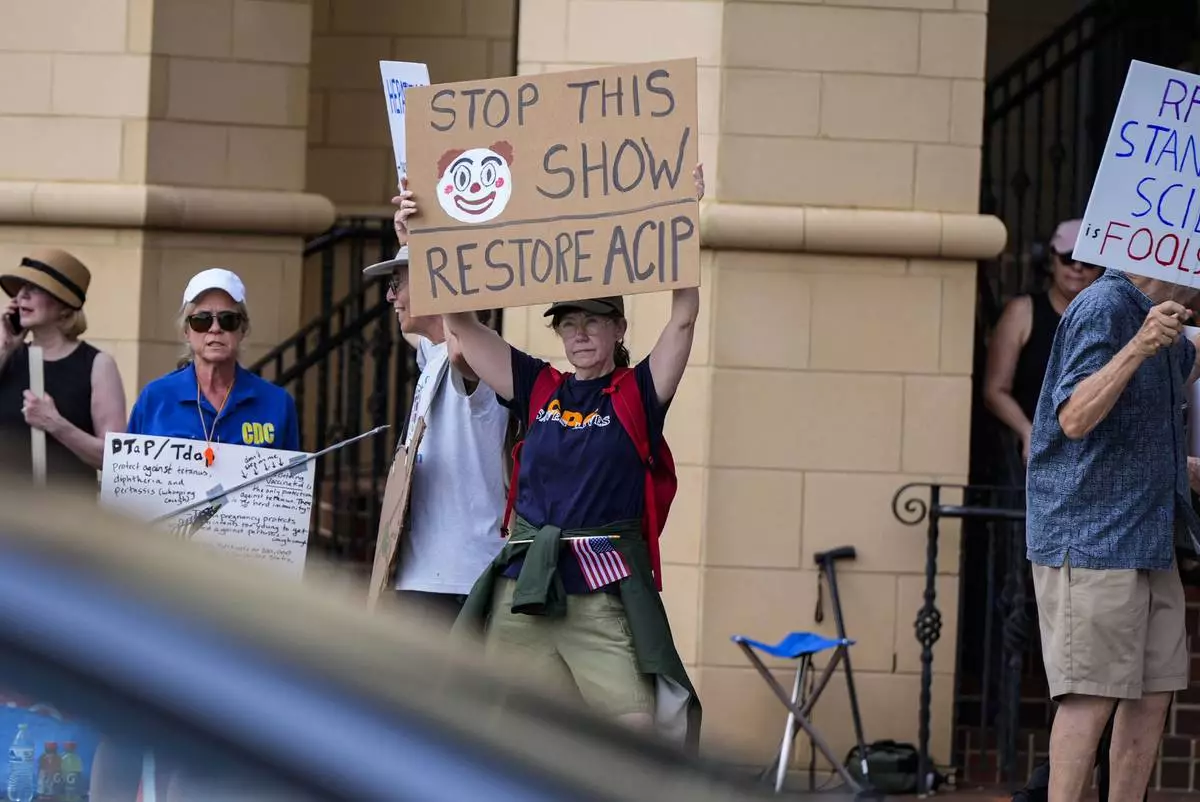 Demonstrators rally for support of the CDC during a meeting of the Advisory Committee in Immunization Practices, Wednesday, June 25, 2025, in Atlanta. (AP Photo/Mike Stewart)