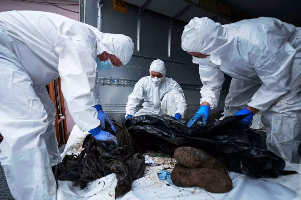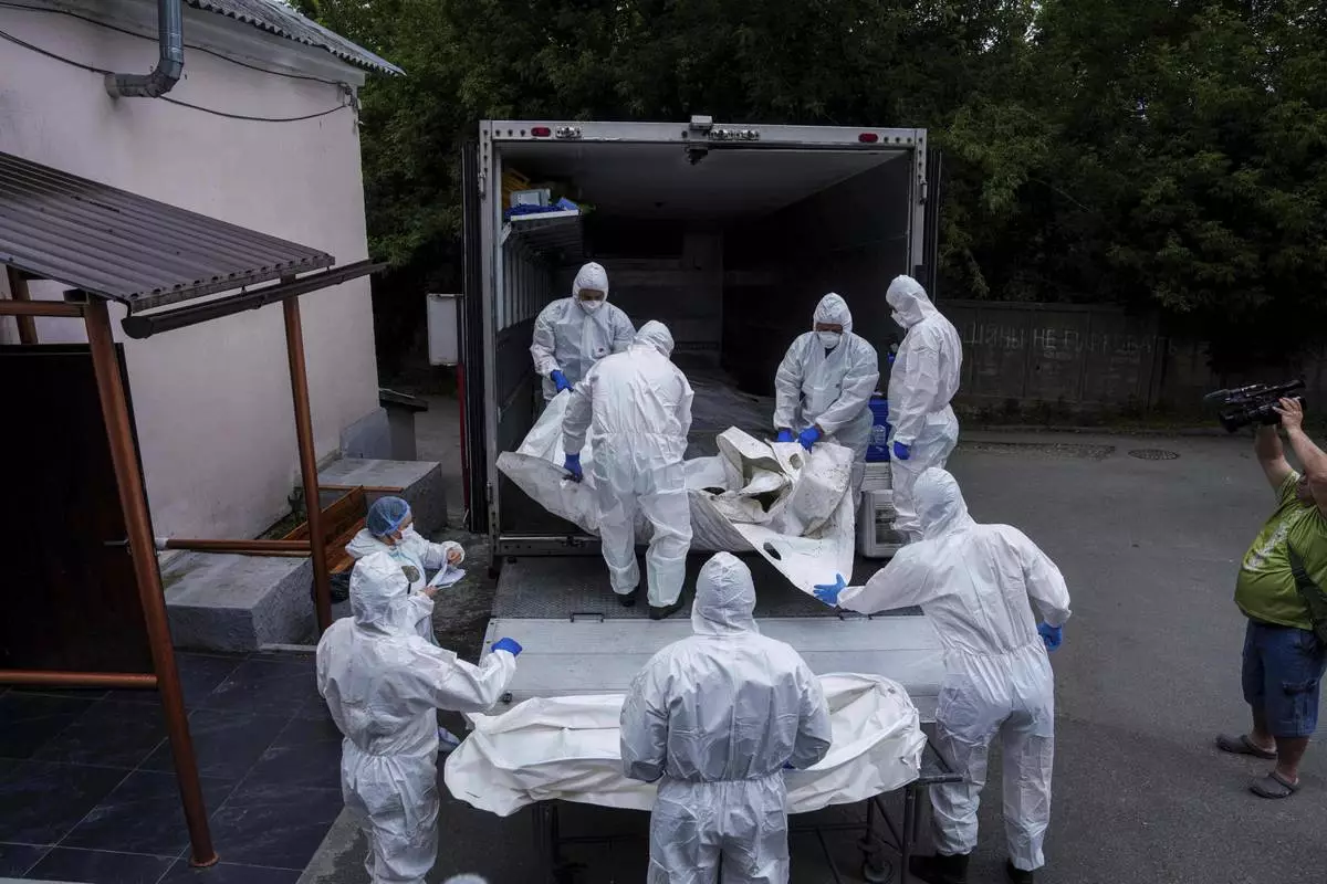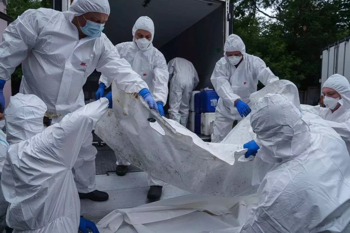 Ukrainian servicemen inspect a body of their comrade repatriated from Russia, at the morgue in Kyiv, Ukraine, on Thursday, June 26, 2025. (AP Photo/Evgeniy Maloletka)