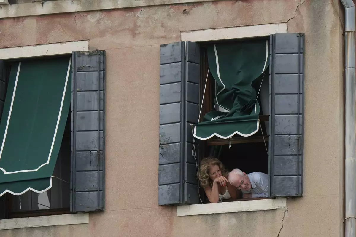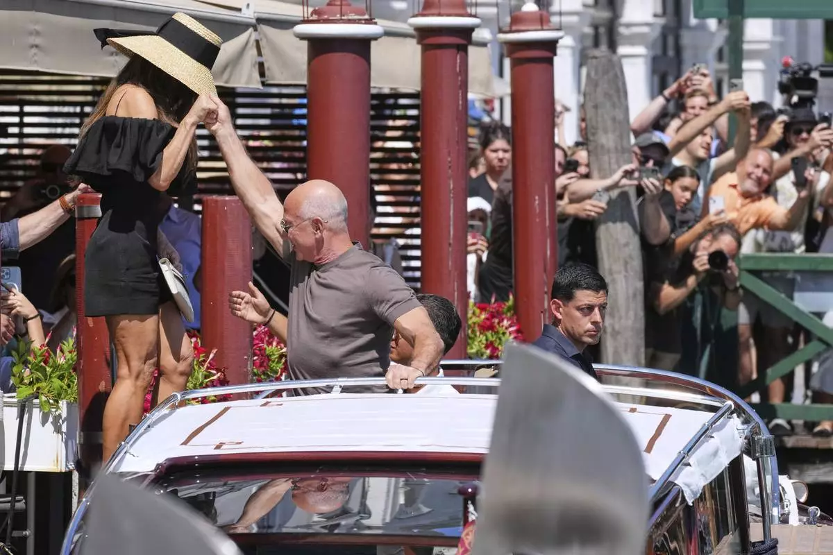 Residents try to catch a glimpse of Jeff Bezos leaving his hotel in Venice, Italy, Friday, June 27, 2025 ahead of the anticipated wedding celebrations with Lauren Sanchez. (AP Photo/Luca Bruno)