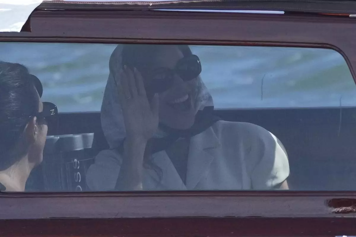 Lauren Sanchez, left, arrives at San Giorgio island ahead of the anticipated wedding celebrations with Jeff Bezos, in Venice, Italy, Friday, June 27, 2025. (AP Photo/Antonio Calanni)