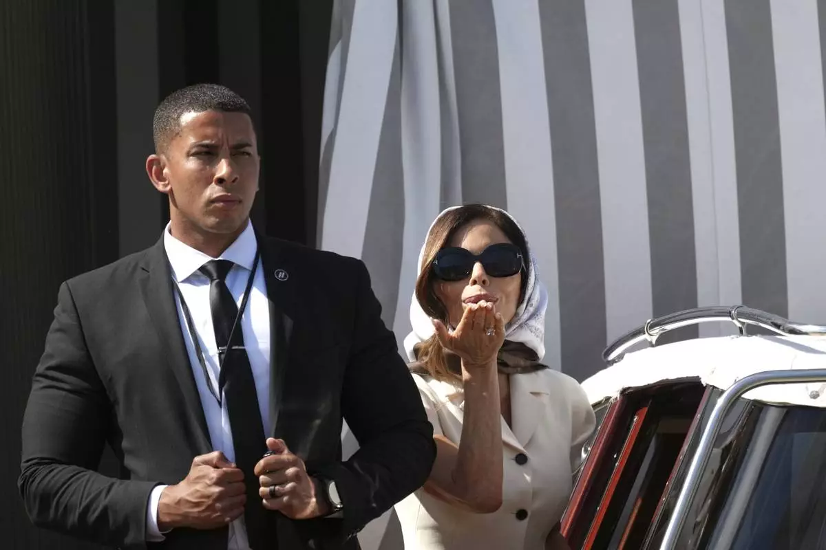Lauren Sanchez, left, leaves her hotel in Venice, Italy, Friday,June 27, 2025 ahead of the anticipated wedding celebrations with Jeff Bezos. (AP Photo/Luca Bruno)