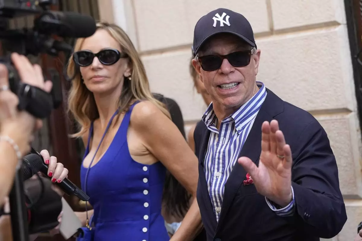 CORRECTS TO HILFIGER, NOT HILFINGER - Tommy Hilfiger and his wife Dee Ocleppo leave Harry's Bar in Venice, Italy, Saturday,June 28, 2025. (AP Photo/Luca Bruno)