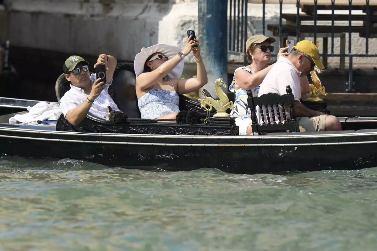 A tourist takes a photograph with her smartphone in Venice, Italy, on Wednesday, June 25, 2025, ahead of festivities in the lagoon city reportedly linked to a wedding celebration for Jeff Bezos and Lauren Sánchez. (AP Photo/Luca Bruno)