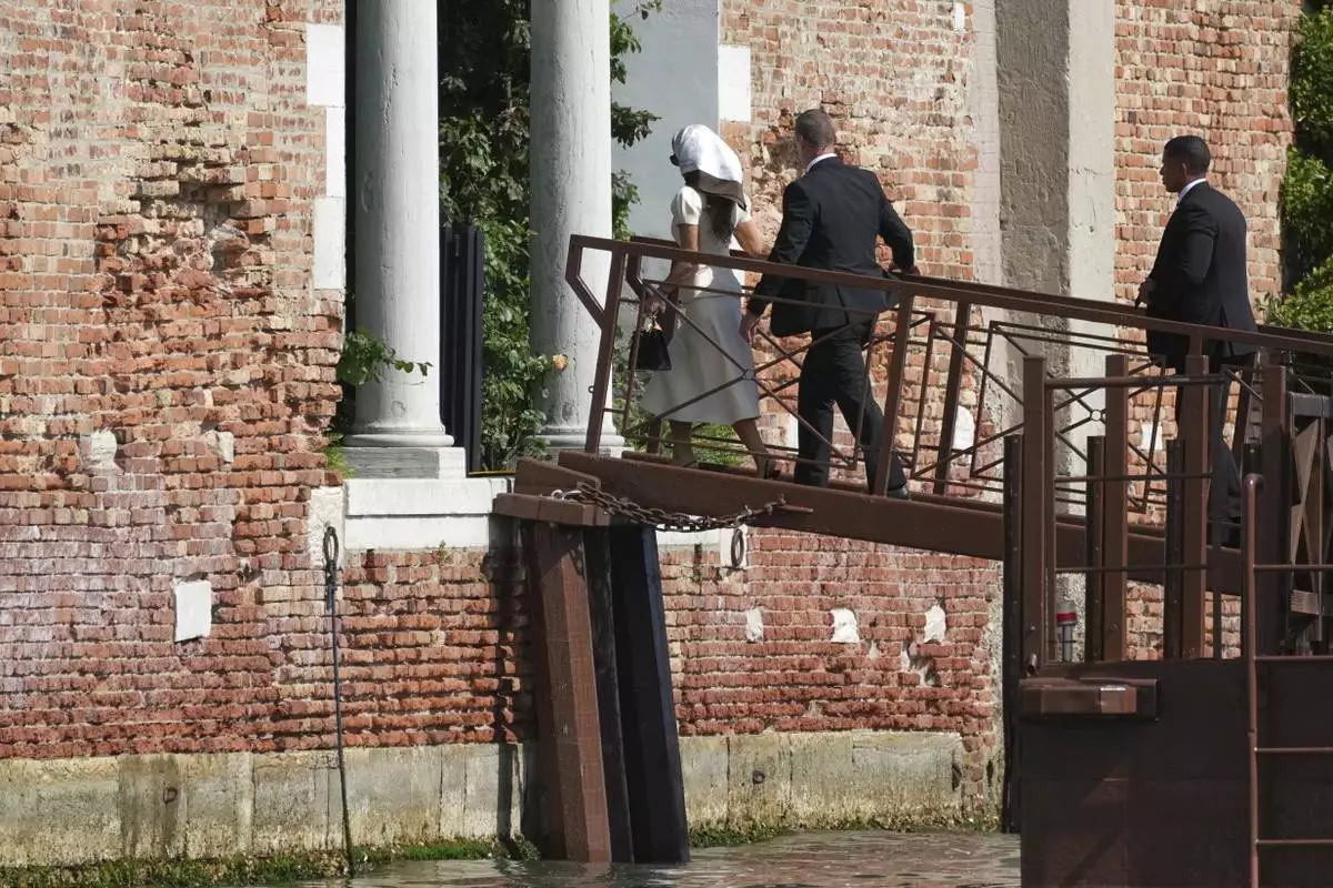 Lauren Sanchez Bezos, left, and Jeff Bezos depart from the Aman hotel during wedding celebrations in Venice, Italy, Saturday, June 28, 2025. (AP Photo/Luca Bruno)