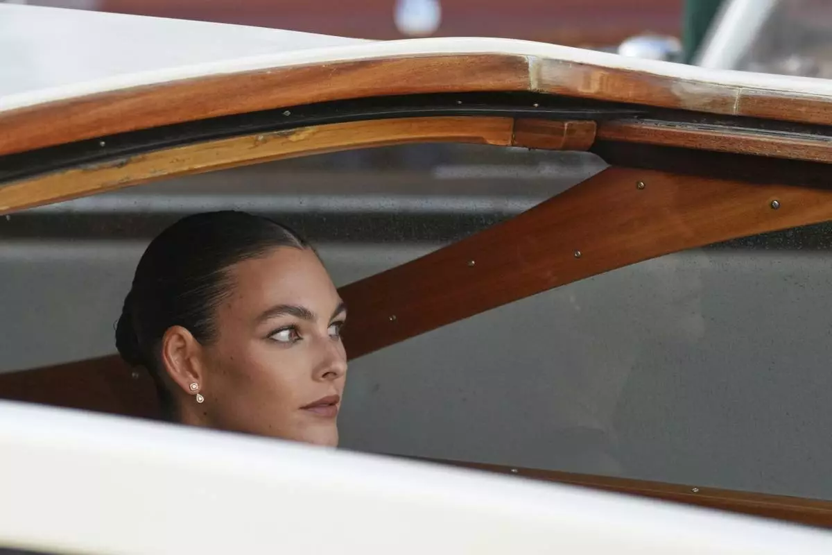 Vittoria Ceretti leaves a hotel ahead of the anticipated wedding celebrations of Jeff Bezos and Lauren Sanchez, in Venice, Italy, Friday, June 27, 2025. (AP Photo/Antonio Calanni)