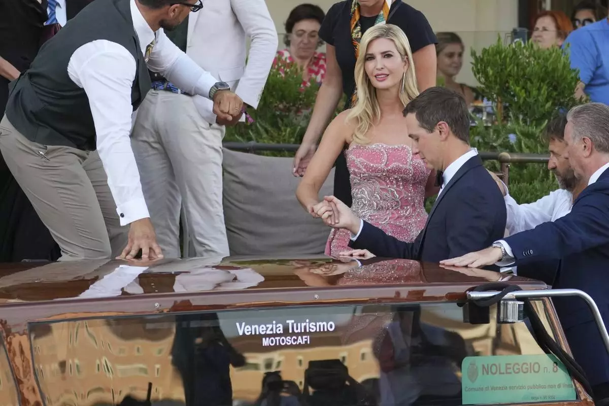 Ivanka Trump, right, and Jared Kushner leave a hotel during celebrations for Jeff Bezos and Lauren Sanchez Bezos' wedding, in Venice, Saturday, June 28, 2025. (AP Photo/Luigi Costantini)
