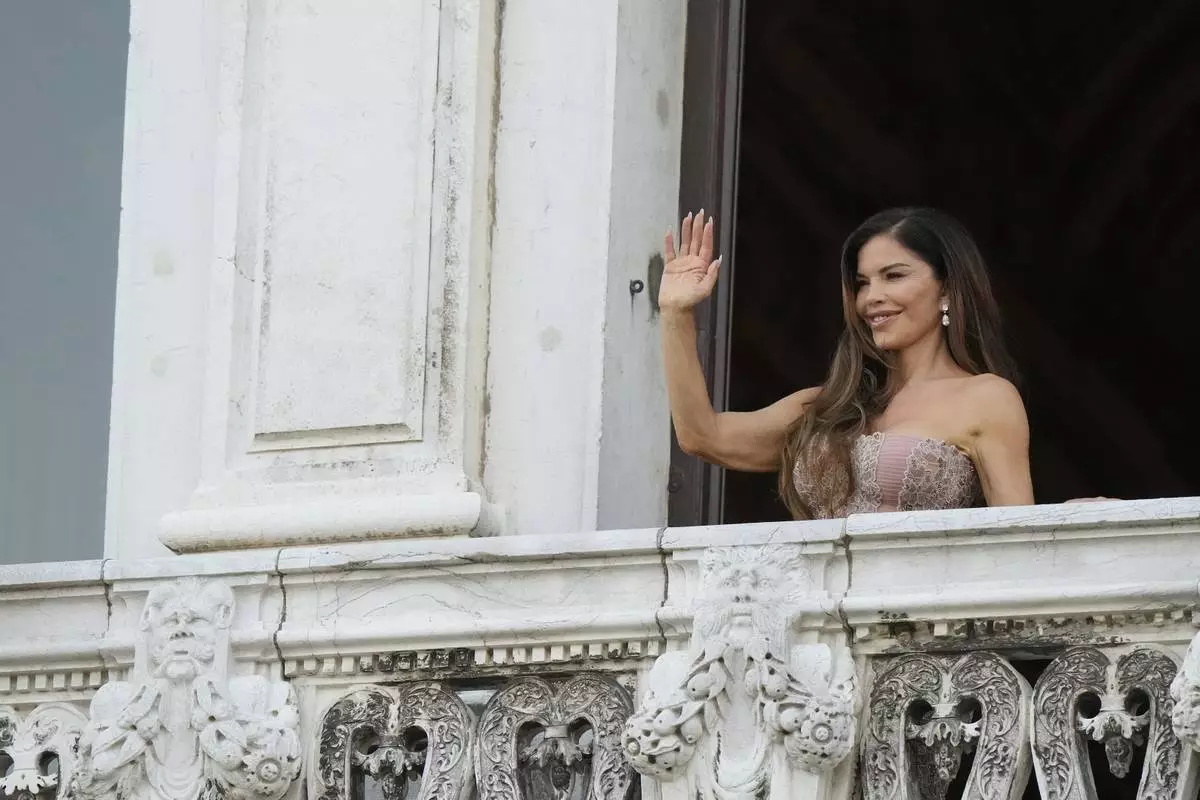 Lauren Sanchez Bezos waves from her balcony during wedding celebrations in Venice, Italy, Saturday, June 28, 2025. (AP Photo/Luca Bruno)