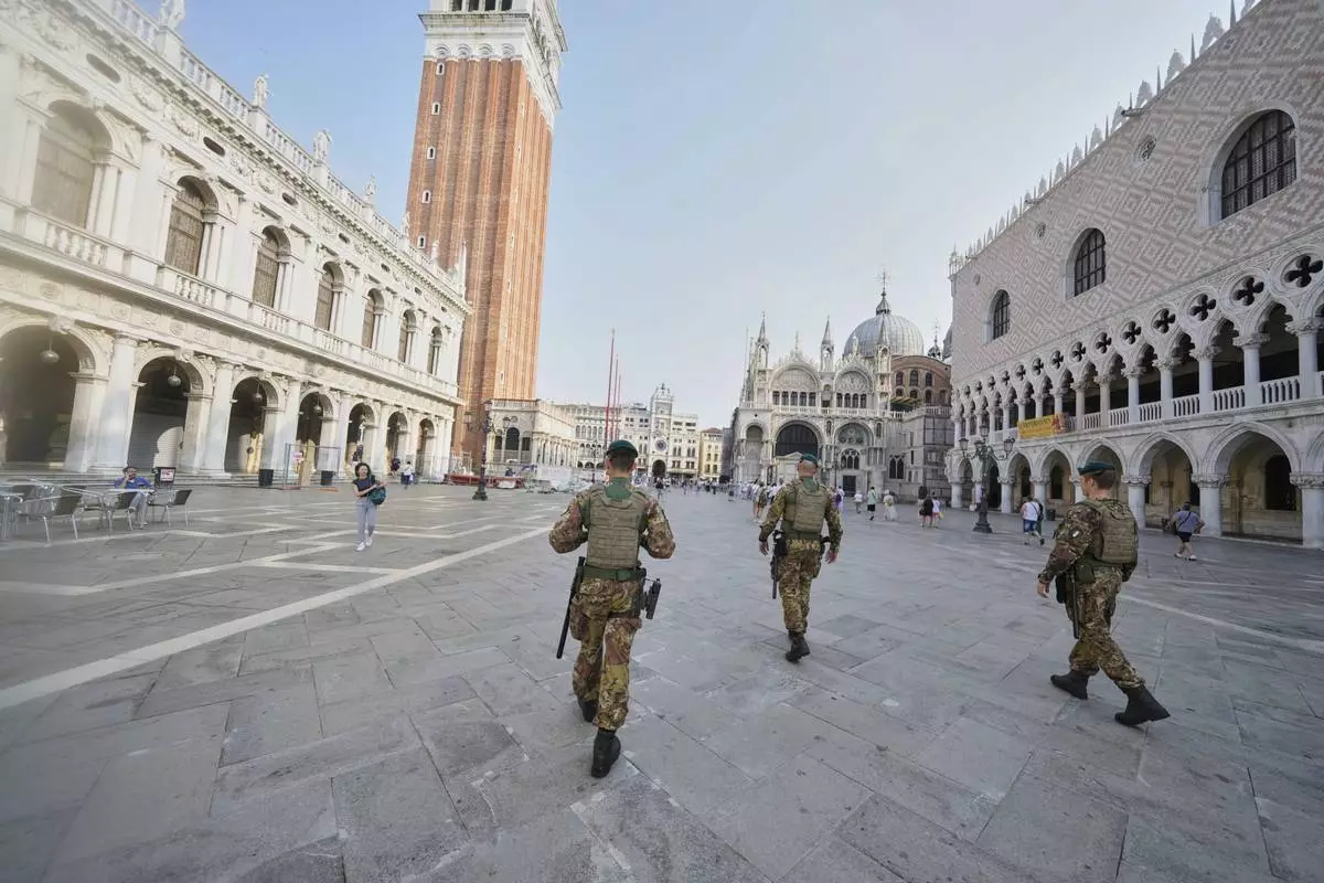 Italian Army soldiers patrol St. Mark’s Square ahead of the weekend wedding of Amazon founder Jeff Bezos and Lauren Sanchez, in Venice, Italy, Thursday, June 26, 2025. (AP Photo/Luca Bruno)