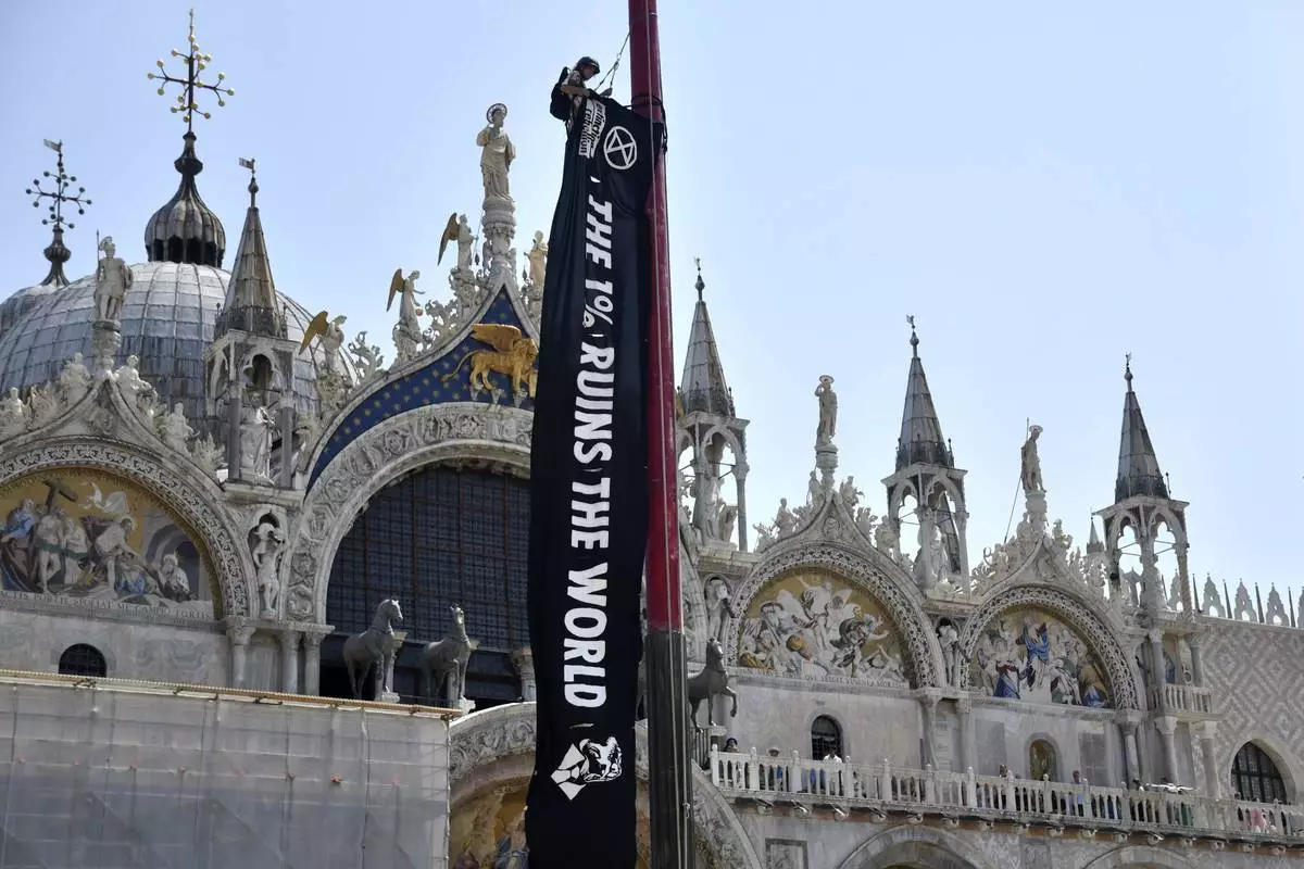 An activist from Extinction Rebellion unfolds a banner in front of St. Mark's Basilica in Venice, Italy, on Thursday, June 26, 2025, ahead of festivities in the lagoon city reportedly linked to a wedding celebration for Jeff Bezos and Lauren Sánchez. (AP Photo/Luigi Costantini)