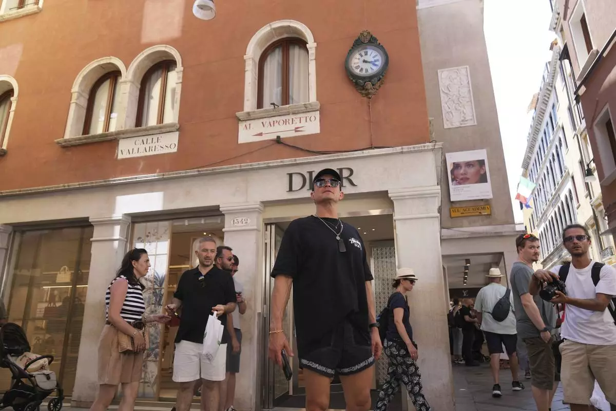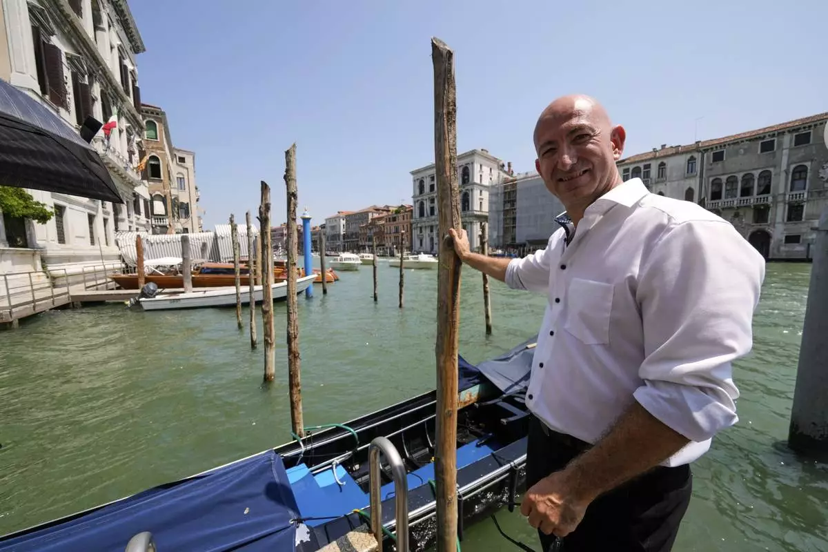 A gondolier tours tourists along the Grand Canal in Venice, Italy, on Wednesday, June 25, 2025, ahead of festivities in the lagoon city reportedly linked to a wedding celebration for Jeff Bezos and Lauren Sánchez. (AP Photo/Luca Bruno)