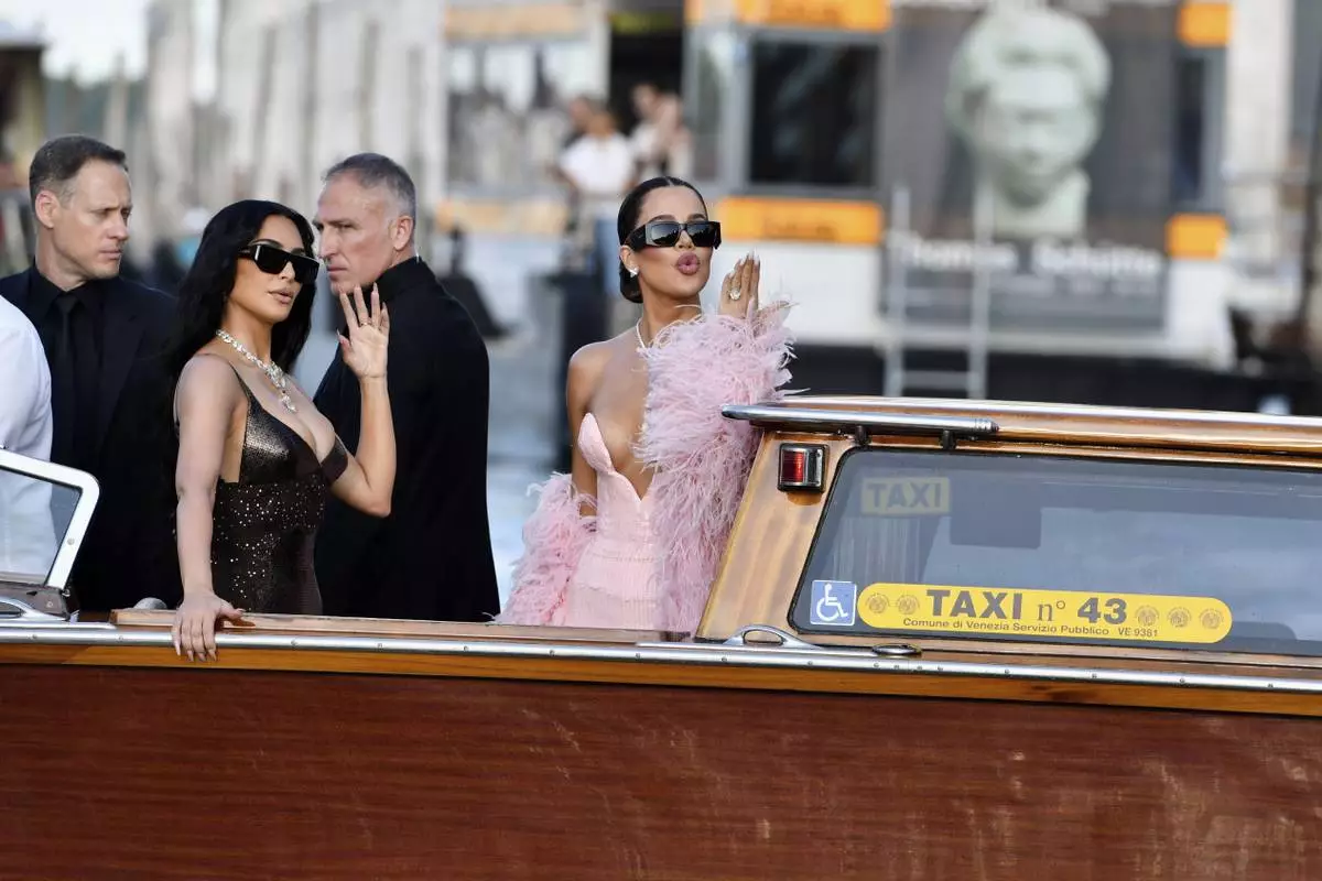Kim Kardashian, center, and sister Khloé Kardashian, arrive in Venice, Italy, Thursday, June 26, 2025, ahead of Jeff Bezos' wedding. (AP Photo/Luigi Costantini)