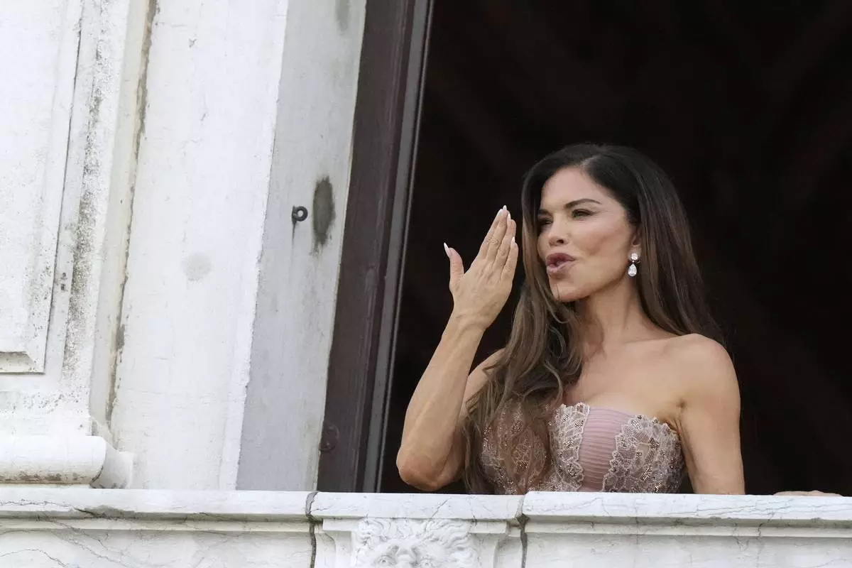 Lauren Sanchez Bezos blows a kiss from her balcony, in Venice, Italy, Saturday, June 28, 2025. (AP Photo/Luca Bruno)