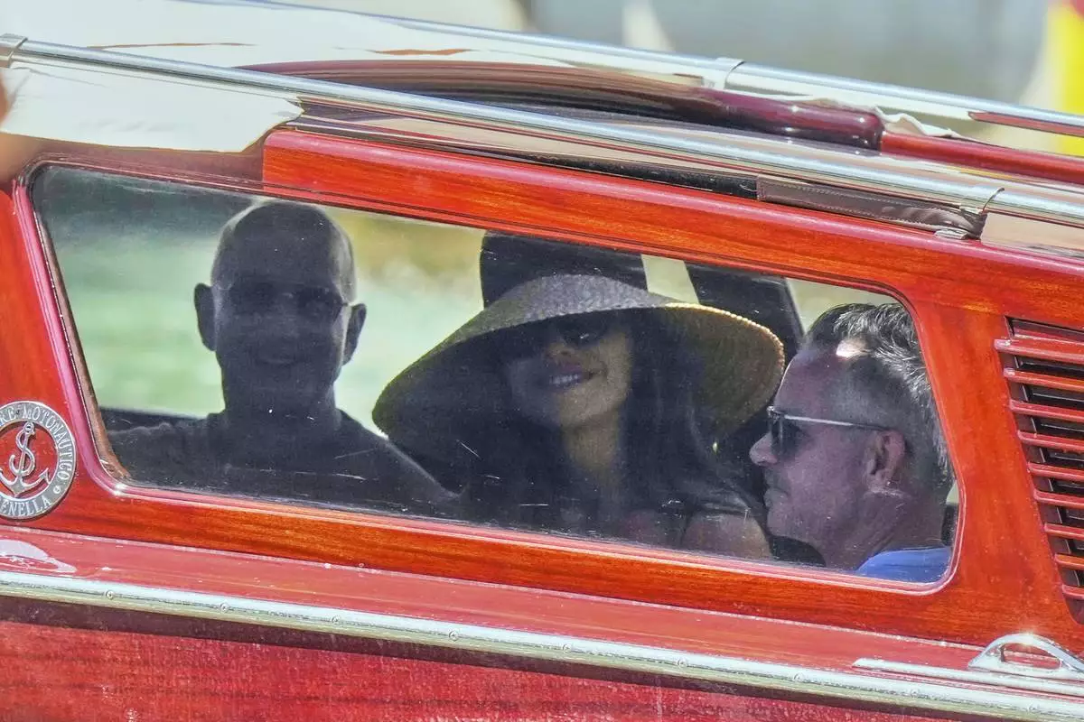 Jeff Bezos and Lauren Sanchez, inside boat, pass by the San Giorgio Maggiore Church on their way to their pre wedding reception, in Venice, Italy, Thursday, June 26, 2025. (AP Photo/Luca Bruno)