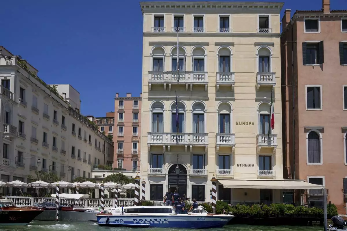 Police patrols outside a hotel on the Grand Canal in Venice, Italy, Friday,June 27, 2025 ahead of the anticipated wedding celebrations of Jeff Bezos and Lauren Sanchez. (AP Photo/Antonio Calanni)