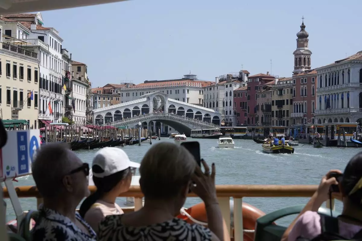 Tourists snap photographs of the Rialto bridge along the Grand Canal in Venice, Italy, on Wednesday, June 25, 2025, ahead of festivities in the lagoon city reportedly linked to a wedding celebration for Jeff Bezos and Lauren Sánchez. (AP Photo/Luca Bruno)
