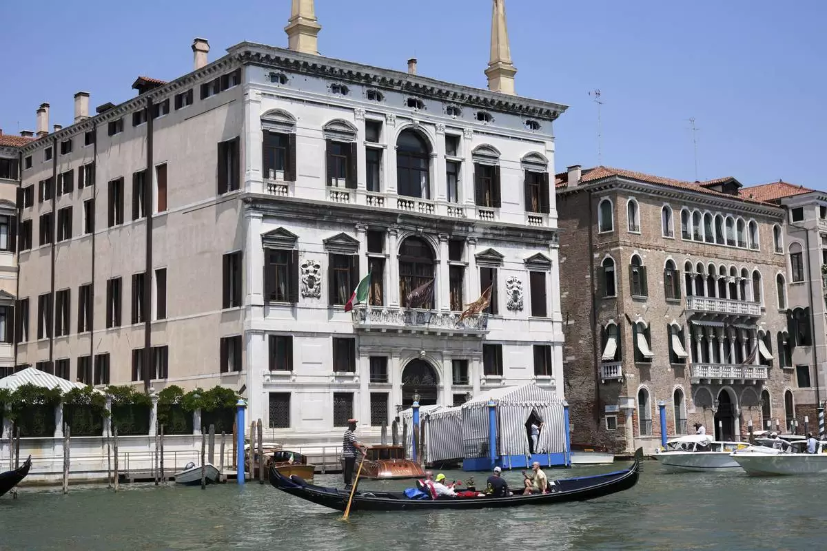 A gondola carries tourists in front of the Aman Hotel along the Grand Canal in Venice, Italy, on Thursday, June 26, 2025, ahead of festivities in the lagoon city reportedly linked to a wedding celebration for Jeff Bezos and Lauren Sánchez. (AP Photo/Luca Bruno)