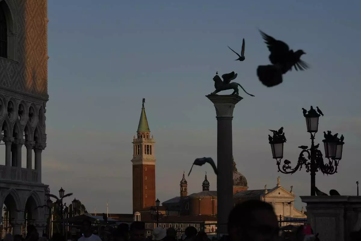 Pigeons fly at sunset over St. George Church on St. George's Island in Venice , Italy, Friday, June 27, 2025. (AP Photo/Luca Bruno)