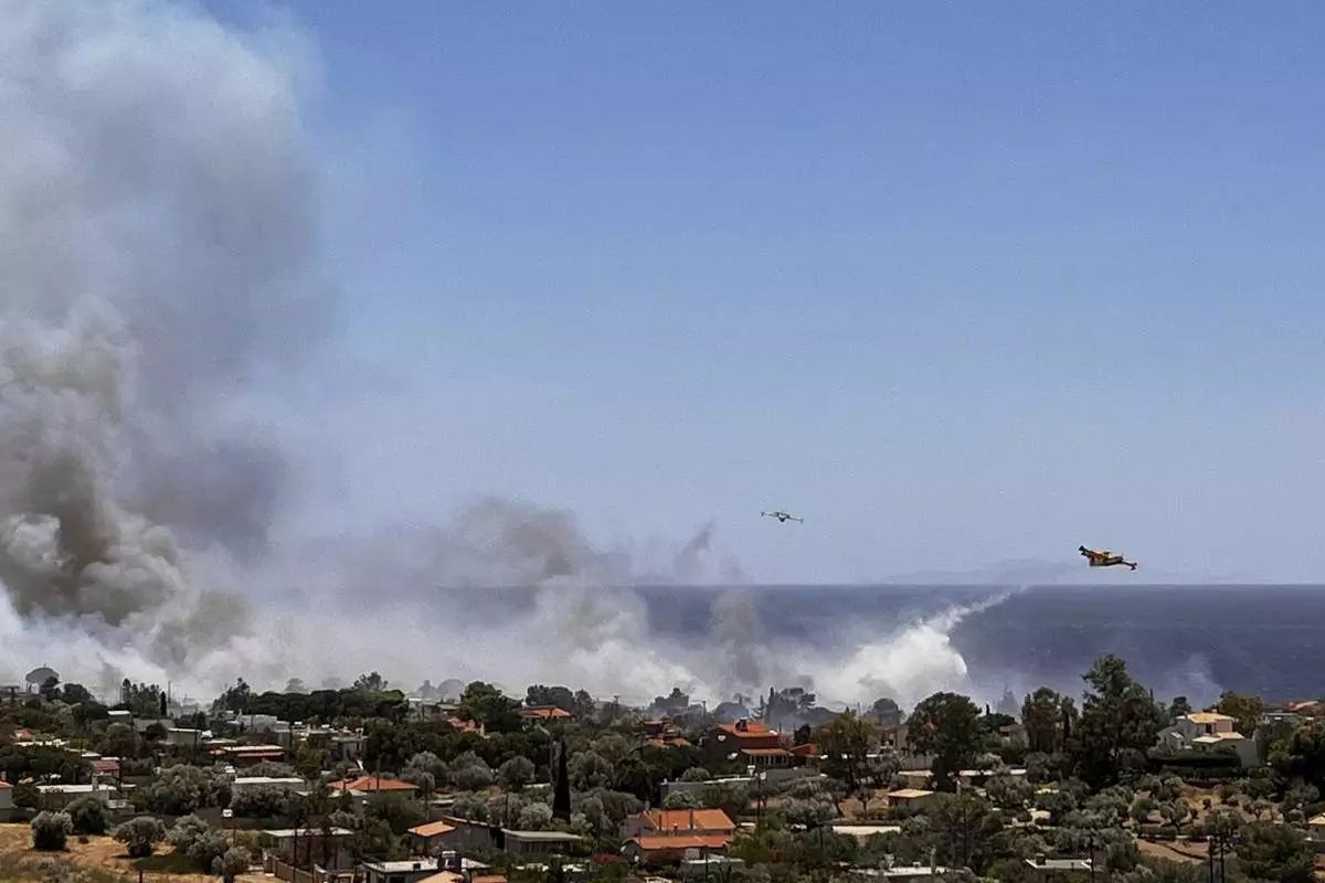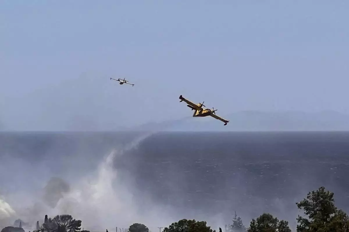 Firefighting planes drop water while battling a blaze in the seaside area of Palaia Fokaia, south of Athens, Thursday, June 26, 2025, as authorities evacuate five locations during Greece's first summer heatwave with temperatures nearing 40 degrees Celsius (104 Fahrenheit).(AP Photo/Giorgos Delveroudis)
