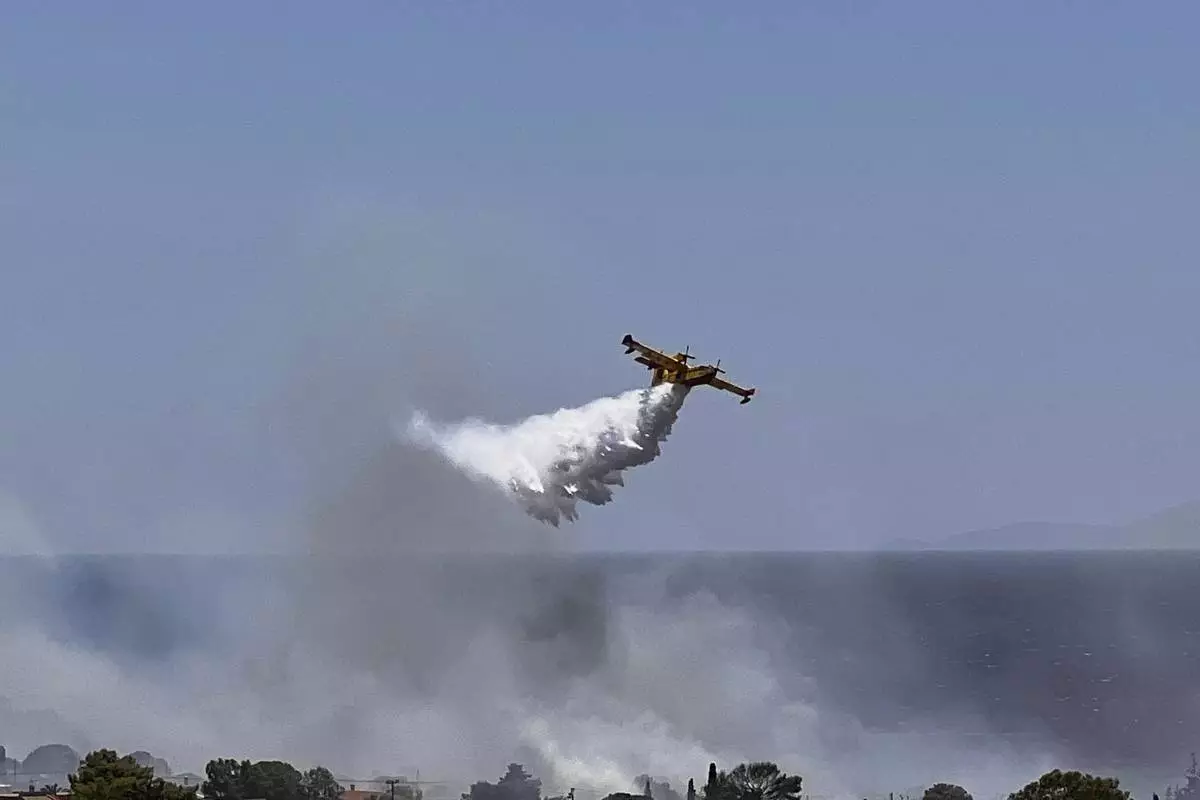 A Firefighting plane drops water while battling a blaze in the seaside area of Palaia Fokaia, south of Athens, Thursday, June 26, 2025, as authorities evacuate five locations during Greece's first summer heatwave with temperatures nearing 40 degrees Celsius (104 Fahrenheit).(AP Photo/Giorgos Delveroudis)