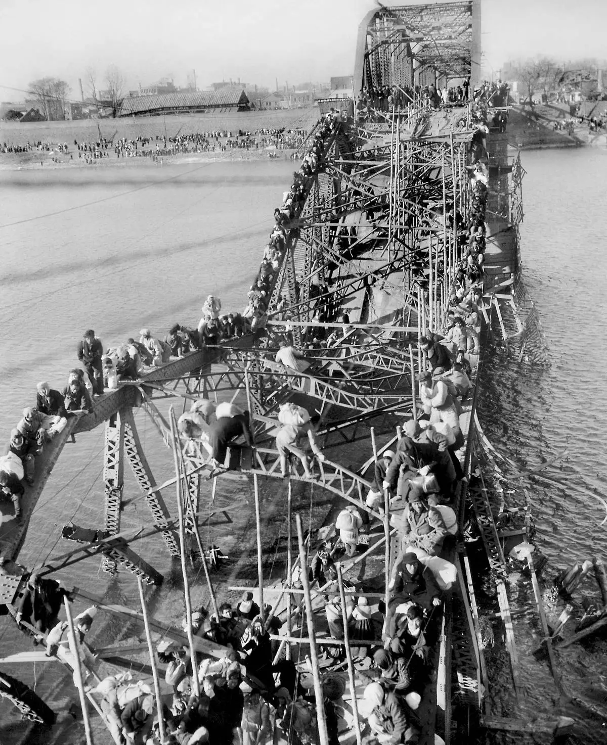 FILE - Residents from Pyongyang, North Korea, and refugees from other areas crawl over shattered girders of the city's bridge Dec. 4, 1950, as they flee south across the Taedong River to escape the advance of Chinese Communist troops. (AP Photo/Max Desfor, File)