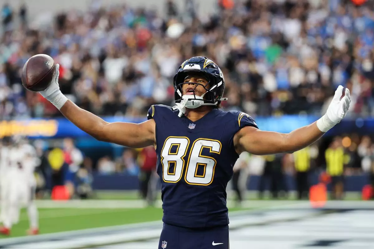 Los Angeles Chargers tight end Oronde Gadsden (86) celebrates his touchdown during the second half of an NFL football game against the Houston Texans Saturday, Dec. 27, 2025, in Inglewood, Calif. (AP Photo/Kevork Djansezian)