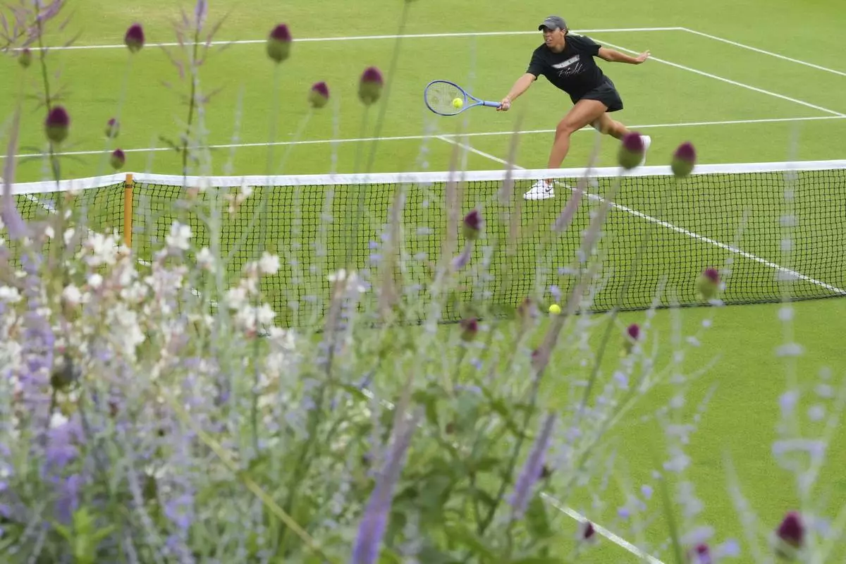 Madison Keys of the United States during a practice session at the All England Lawn Tennis and Croquet Club, ahead of the Wimbledon Championships in London, Thursday, June 26, 2025. (AP Photo/Kirsty Wigglesworth)