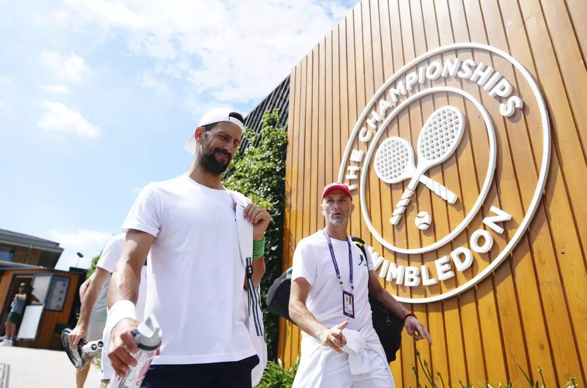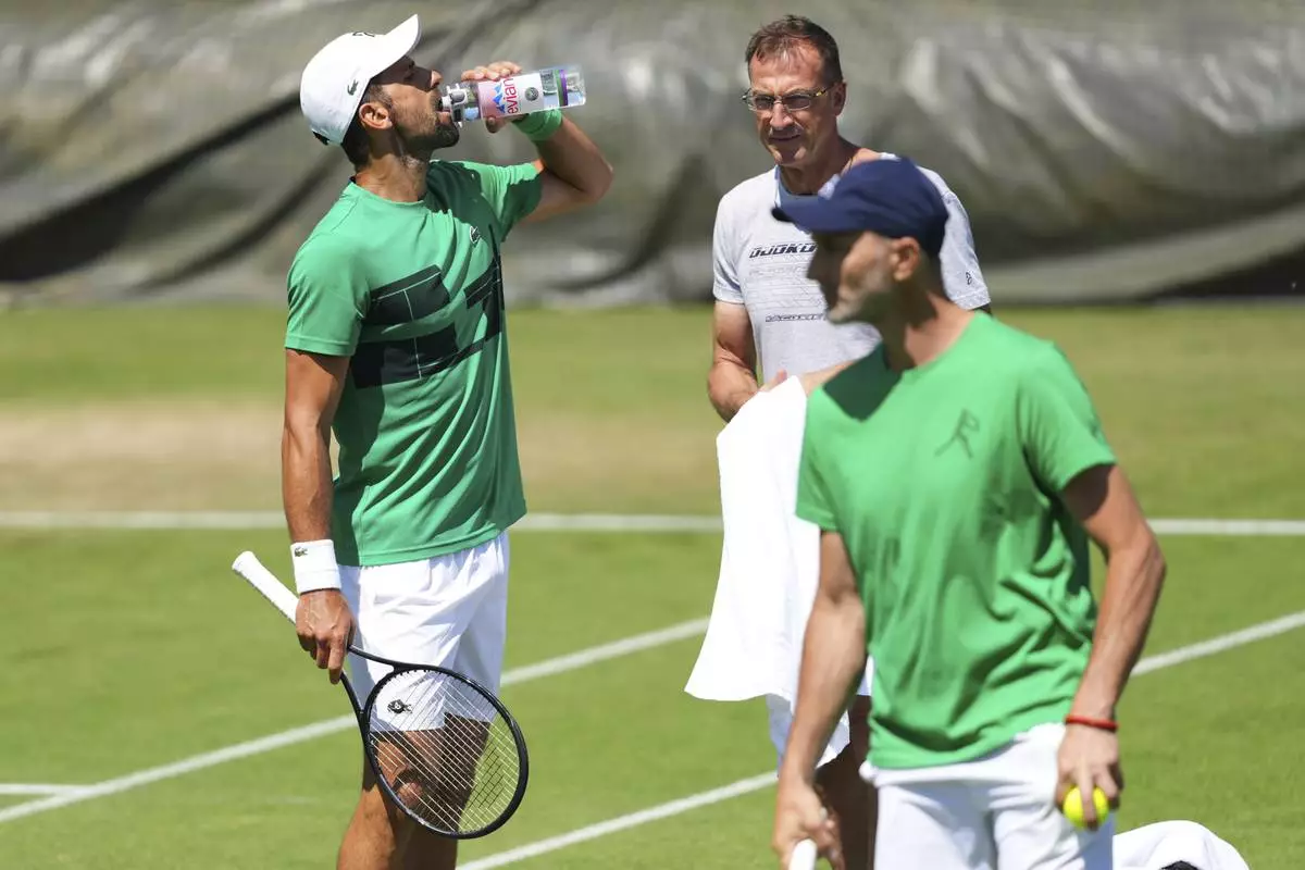 Novak Djokovic of Serbia with members of his team during a practice session ahead of the Wimbledon Championships at the All England Lawn Tennis and Croquet Club in London, Sunday, June 29, 2025. (AP Photo/Kirsty Wigglesworth)