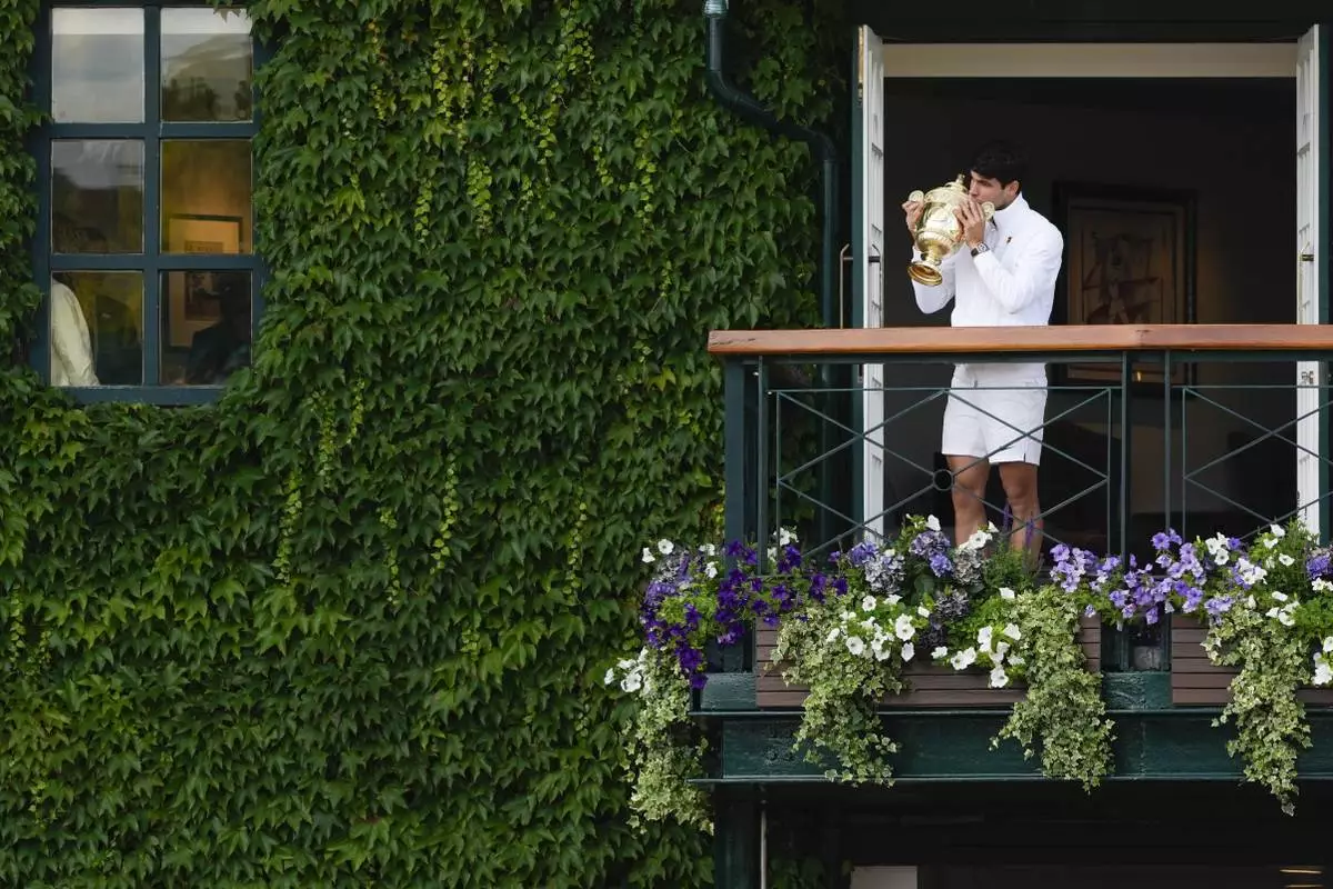 FILE - Carlos Alcaraz of Spain kisses his trophy on the balcony of Centre Court for the crowds gathered below after defeating Novak Djokovic of Serbia in the men's singles final at the Wimbledon tennis championships in London, Sunday, July 14, 2024. (AP Photo/Kirsty Wigglesworth,File)