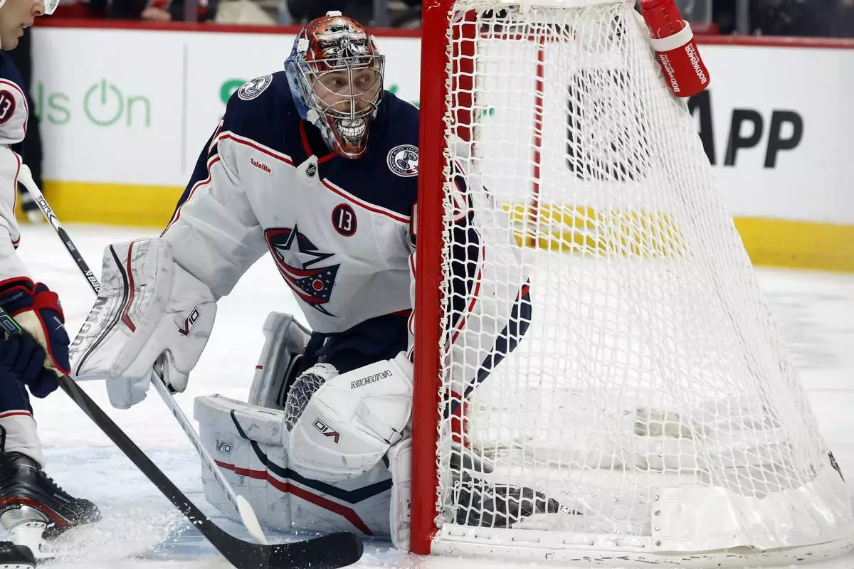 FILE - Columbus Blue Jackets goaltender Daniil Tarasov (40) watches the puck against the Carolina Hurricanes during the second period of an NHL hockey game in Raleigh, N.C., on Jan. 23, 2025. (AP Photo/Karl DeBlaker, File)