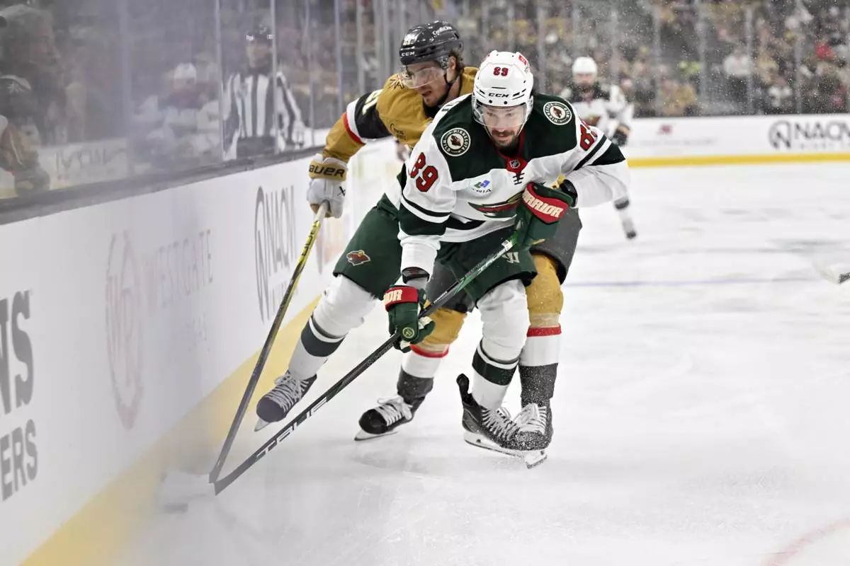 FILE - Vegas Golden Knights center Brett Howden (21) and Minnesota Wild center Frederick Gaudreau (89) battle for the puck during the first period of Game 5 of a first-round NHL hockey playoff series on April 29, 2025, in Las Vegas. (AP Photo/David Becker, File)