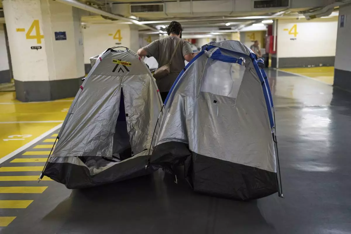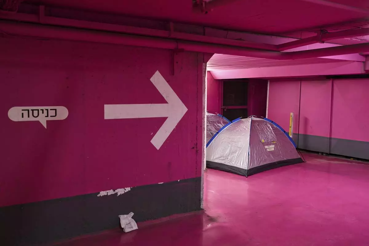 Sleeping tents are placed in an underground parking garage used as a shelter from missile strikes from Iran, in Tel Aviv, Israel, Saturday, June 21, 2025. Writing in Hebrew reads "Entry". (AP Photo/Bernat Armangue)