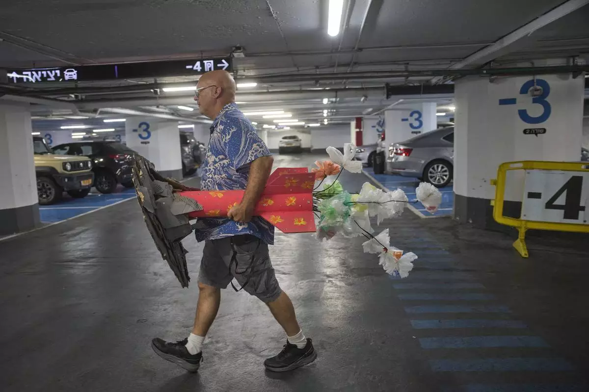 A man carries a mock rocket in a underground parking garage which people used it to take shelter as a safety precaution after a ceasefire was announced, in Tel Aviv, Israel, Tuesday, June 24, 2025. (AP Photo/Ohad Zwigenberg)