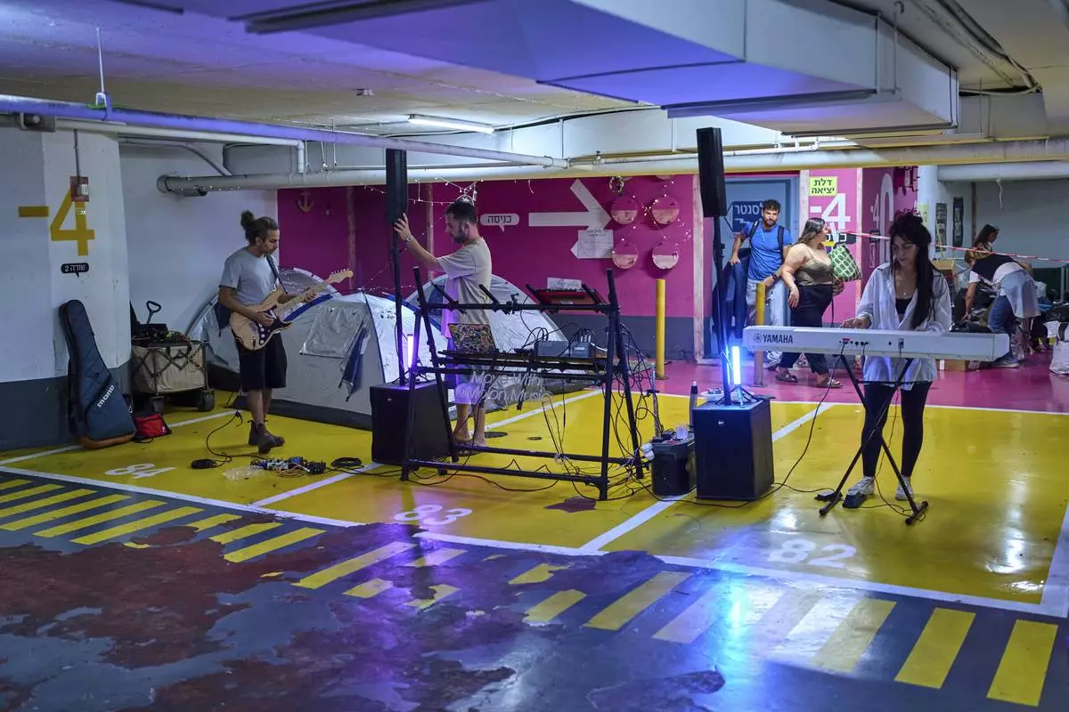 A music band performs inside an underground parking lot, for protection from potential missile strikes from Iran, in Tel Aviv, Israel, Saturday, June 21, 2025. (AP Photo/Bernat Armangue)