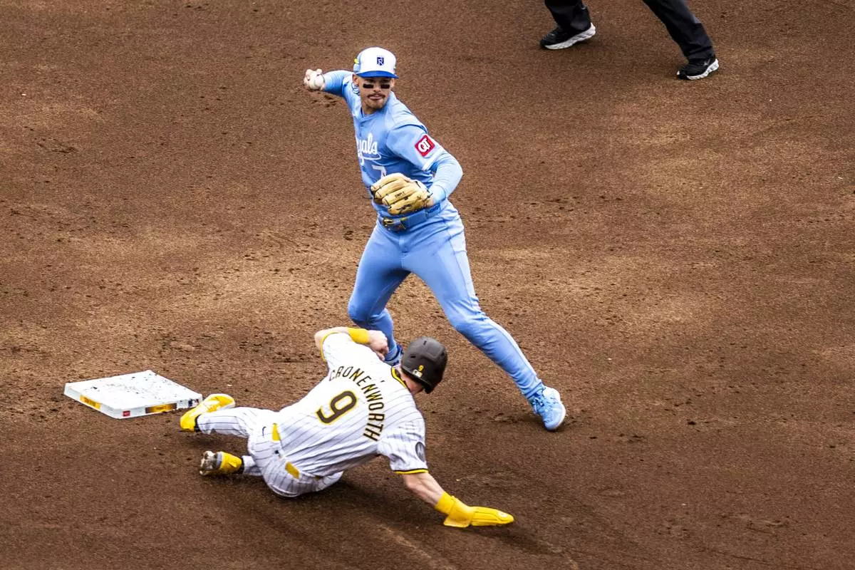 Kansas City Royals' Bobby Witt Jr. turns on a double play throwing to first as San Diego Padres' Jake Cronenworth slides out at second, in the second inning of a baseball game, Saturday, June 21, 2025, in San Diego. (AP Photo/Tony Ding)