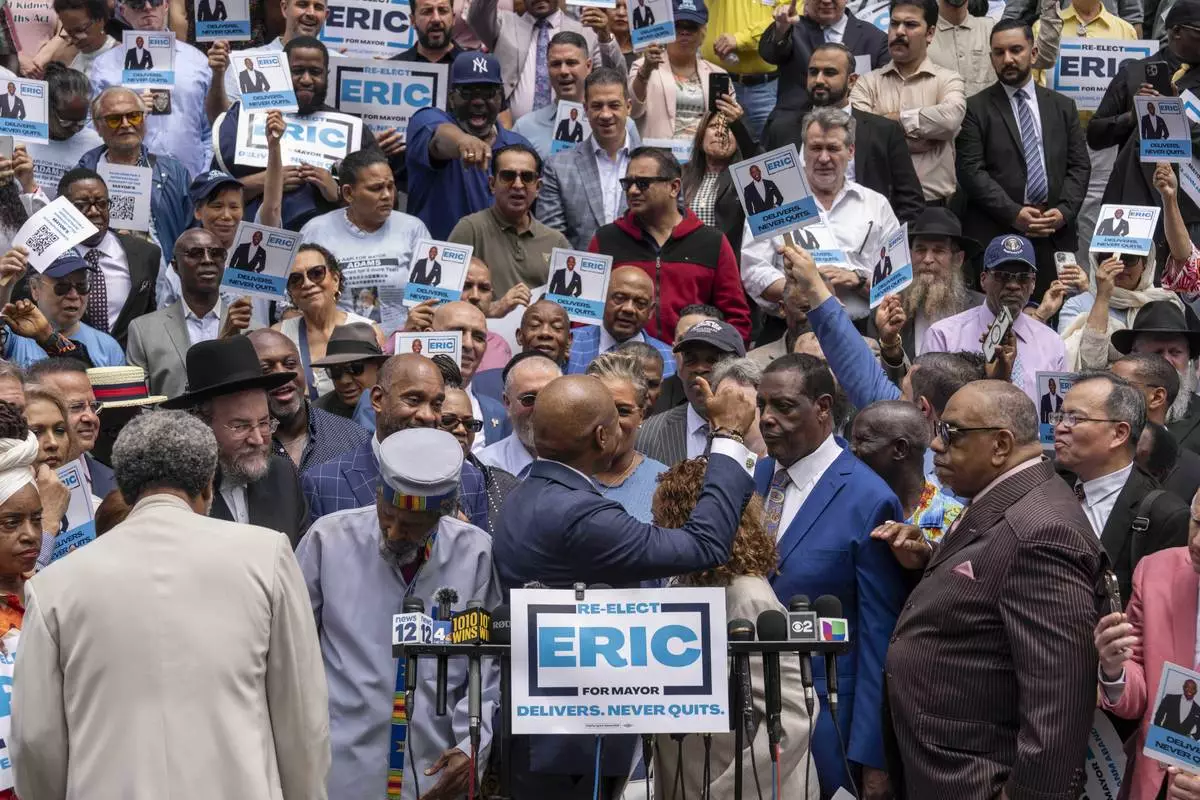 Protesters frequently interrupted his reelection rally on Thursday, chanting from a nearby park. As Adams stepped behind a podium and readied himself to deliver remarks, a protester emerged just feet away, yelling at the mayor. He was swiftly removed. Almost immediately after, another protester appeared, calling the mayor a “criminal” before he too was removed.