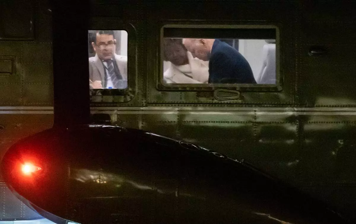 FILE - Anthony Bernal, left, assistant to the president and adviser to the first lady, White House press secretary Karine Jean-Pierre, and President Joe Biden are seated on Marine One as they approach for landing on the South Lawn of the White House, Monday, Nov. 21, 2022, in Washington.(AP Photo/Alex Brandon, File)