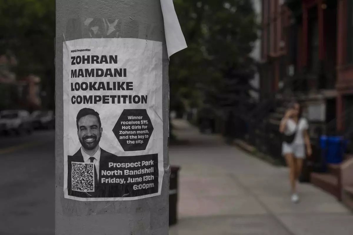 A poster for democratic mayoral candidate Zohran Mamdani's lookalike competition is advertised on the traffic pole, Thursday, June. 26, 2025, in New York. (AP Photo/Yuki Iwamura)
