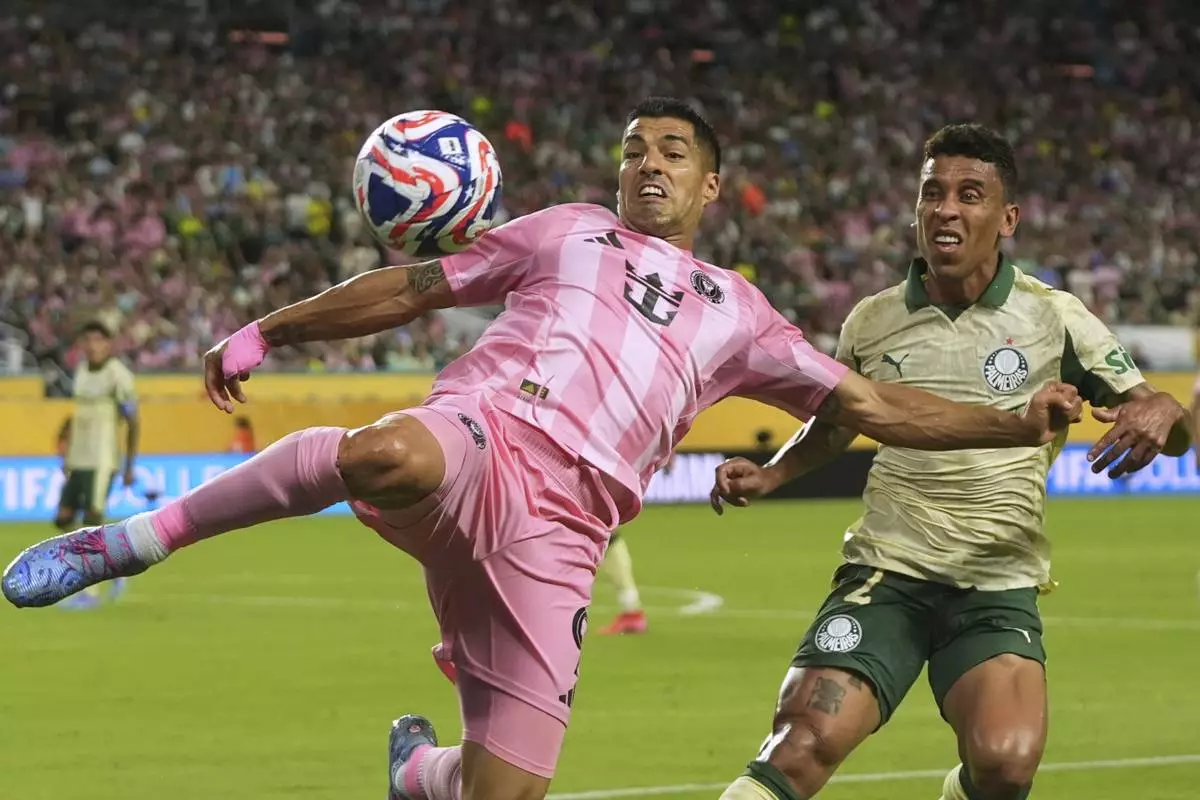 Inter Miami's Luis Suarez kicks the ball away from Palmeiras' Marcos Rocha during the Club World Cup Group A soccer match between Inter Miami and Palmeiras in Miami Gardens, Fla., Monday, June 23, 2025. (AP Photo/Lynne Sladky)