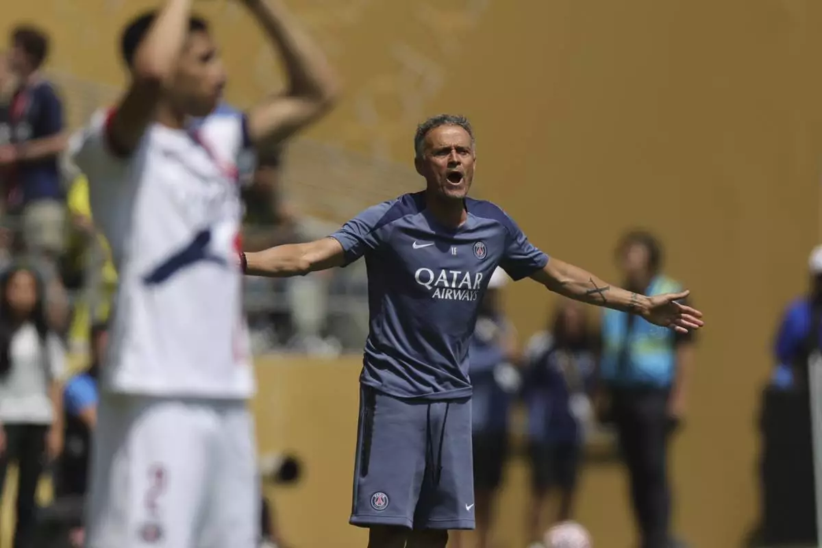 Paris Saint-Germain manager Luis Enrique directs his players during the Club World Cup Group B soccer match between Seattle Sounders and PSG in Seattle, Monday, June 23, 2025. (AP Photo/Ryan Sun)