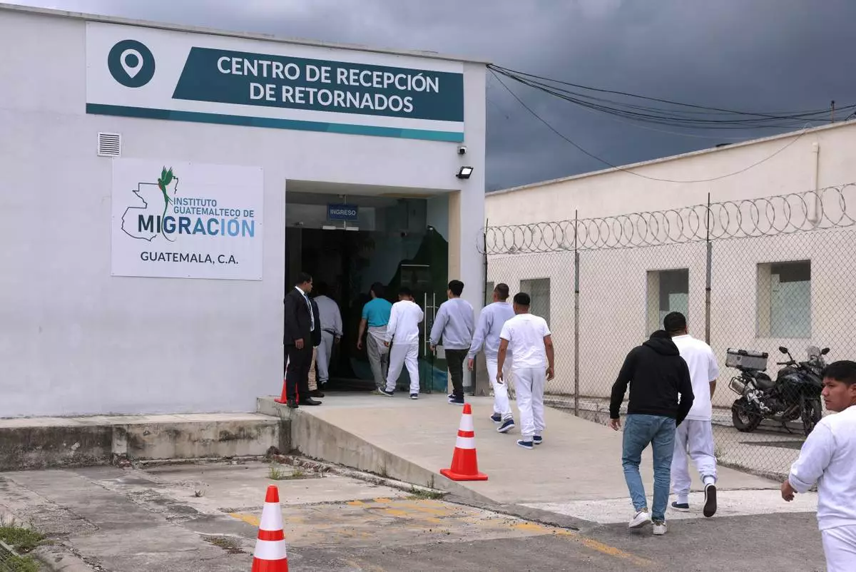 People deported from the United States walk into a processing center after arriving on a repatriation flight, during a Department of Homeland Security operations tour for visiting Homeland Security Secretary Kristi Noem, at La Aurora International Airport in Guatemala City, Thursday, June 26, 2025. (Anna Moneymaker/Pool Photo via AP)