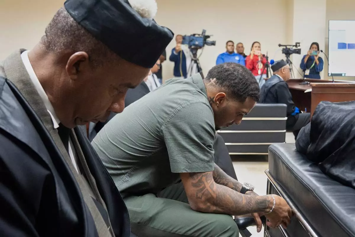 Tampa Bay Rays shortstop Wander Franco, left, reacts after hearing his sentence during his trial on charges of sexual abuse of a minor, in Puerto Plata, Dominican Republic, Thursday, June 26, 2025. (AP Photo/Fran Afonso)