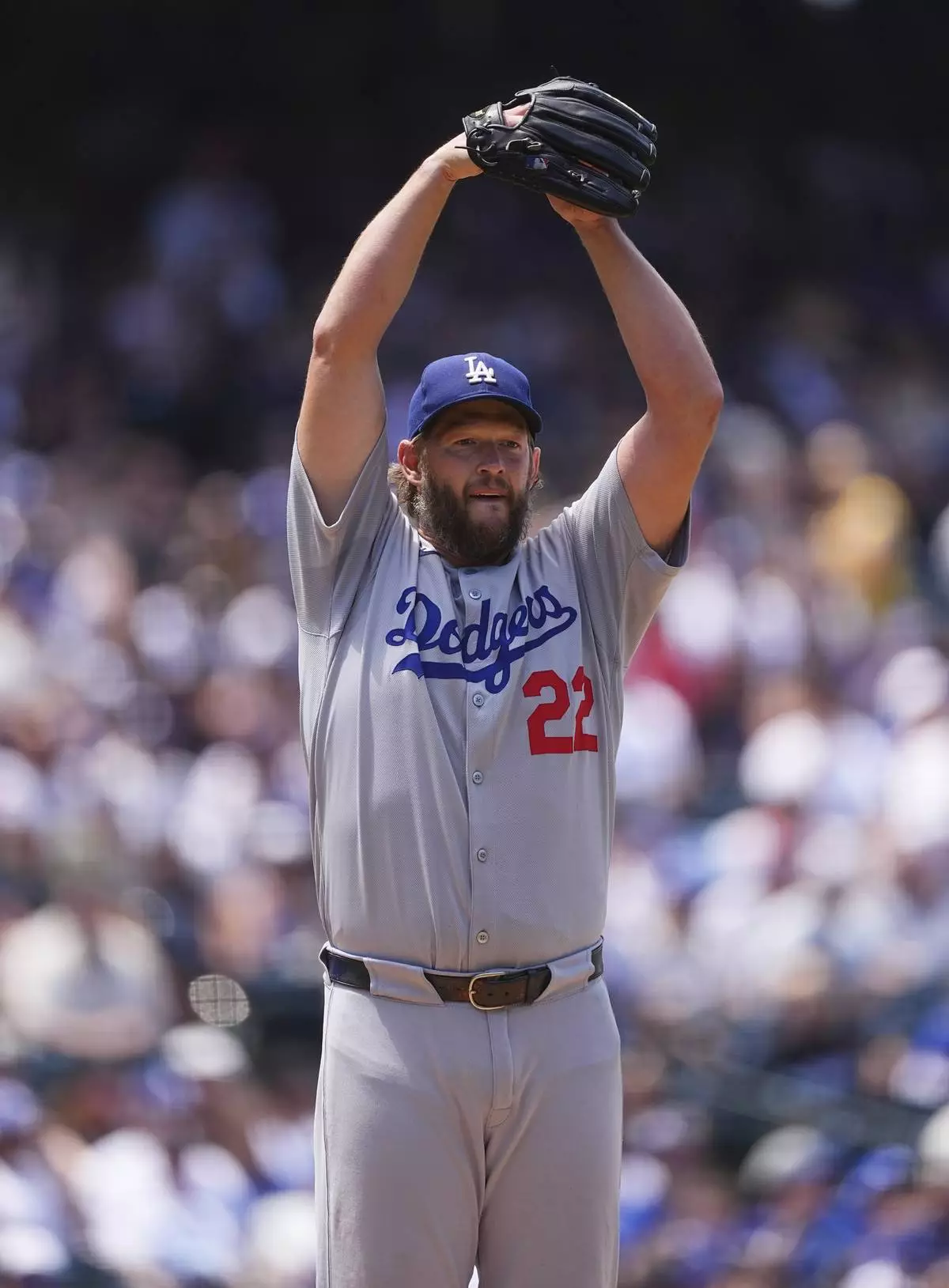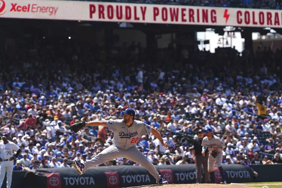 Los Angeles Dodgers starting pitcher Clayton Kershaw (22) works against the Colorado Rockies in the sixth inning of a baseball game Thursday, June 26, 2025, in Denver. (AP Photo/David Zalubowski)