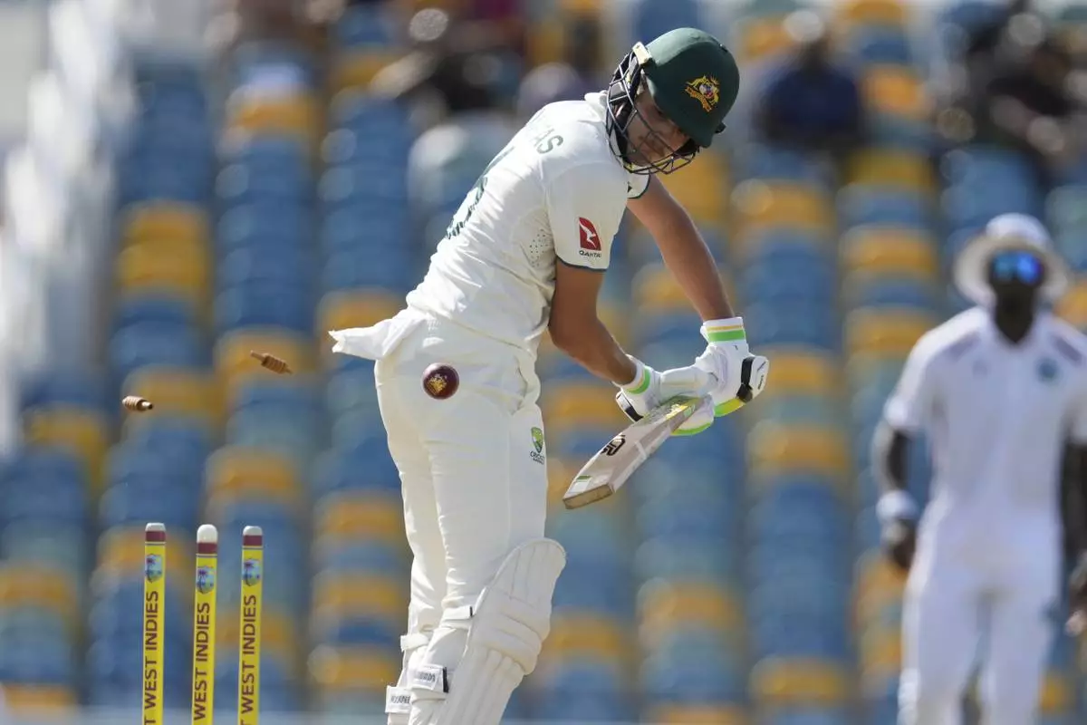 Australia's Sam Konstas is bowled by West Indies' Shamar Joseph on day two of the first cricket Test match at Kensington Stadium in Bridgetown, Barbados, Thursday, June 26, 2025. (AP Photo/Ricardo Mazalan)