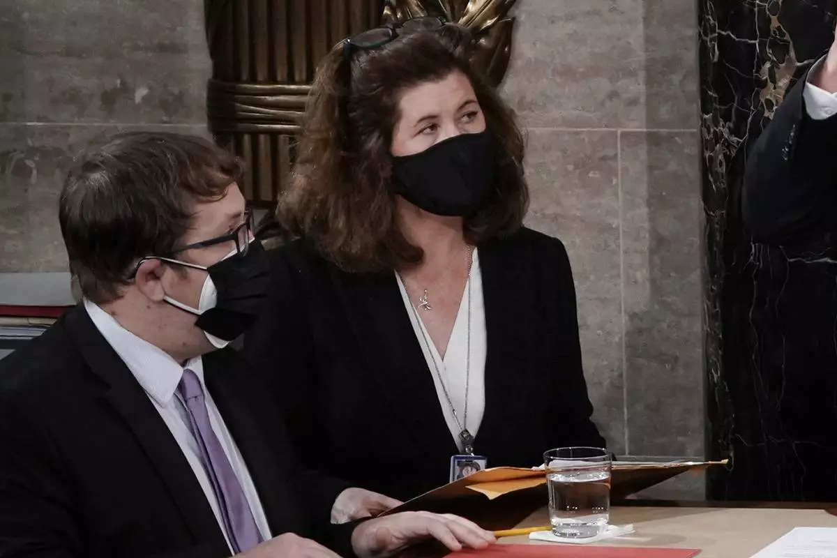 FILE - Senate Parliamentarian Elizabeth MacDonough watches during the certification of Electoral College ballots in the presidential election, in the House chamber at the Capitol in Washington, Jan. 6, 2021. (AP Photo/J. Scott Applewhite, File)