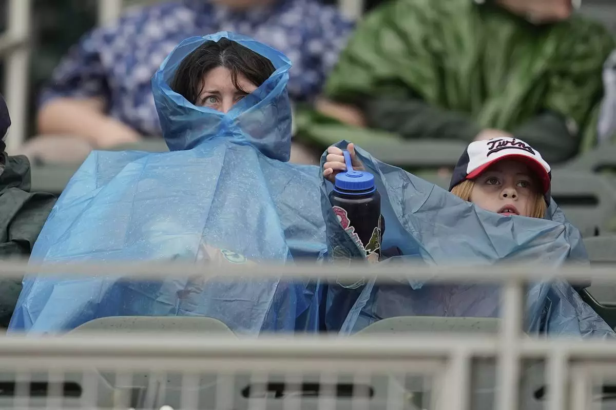 Fans are covered up with ponchos during a rain delay before a baseball game between the Minnesota Twins and Seattle Mariners, Thursday, June 26, 2025, in Minneapolis. (AP Photo/Abbie Parr)