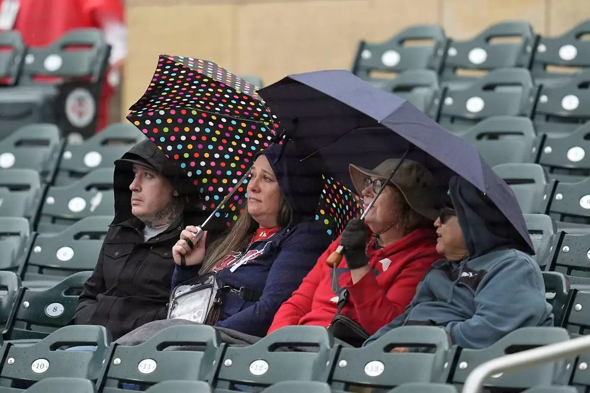 Fans, with umbrellas, sit in seats during a rain delay before a baseball game between the Minnesota Twins and Seattle Mariners, Thursday, June 26, 2025, in Minneapolis. (AP Photo/Abbie Parr)