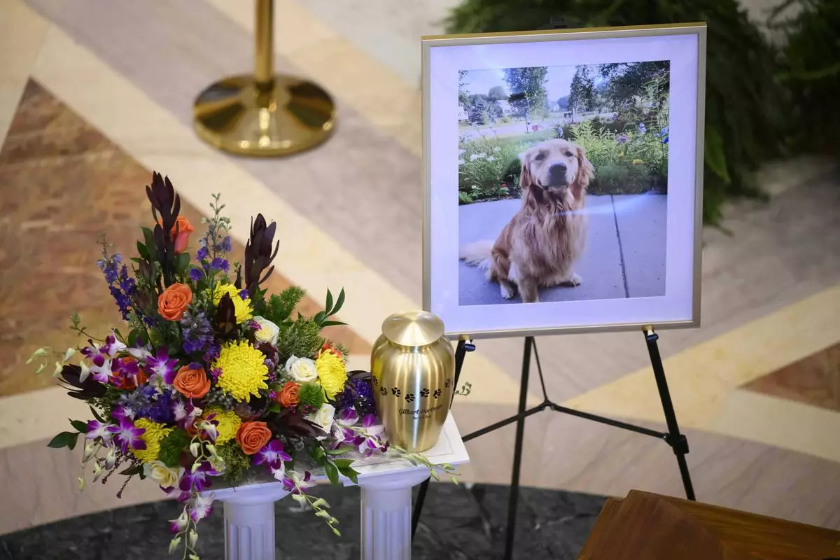 The urn carrying the remains of Gilbert, the dog of Minnesota state Rep. Melissa Hortman and her husband, Mark Hortman, is diplayed at the Minnesota State Capitol in St. Paul, Minn., on Friday, June 27, 2025. (Aaron Lavinsky/Star Tribune via AP)